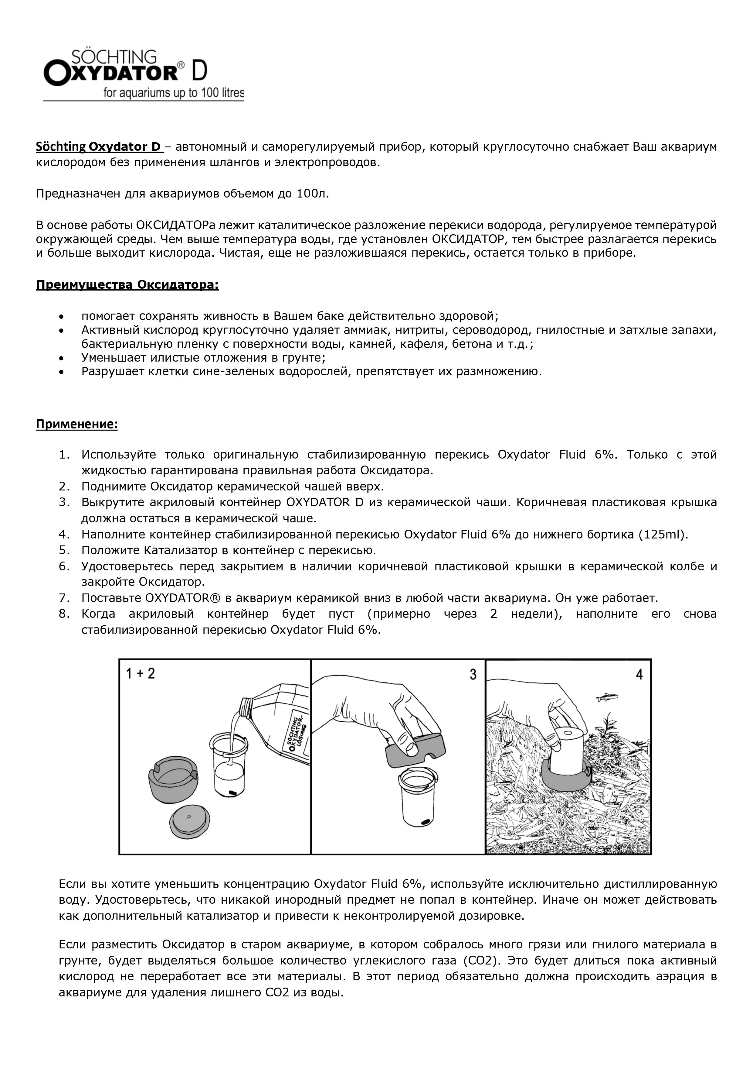 Використання нестабілізованих (саморобних) розчинів може призвести до неефективної роботи ОКСИДАТОРа. Помилково приготовлений розчин підвищеної концентрації призведе до загибелі риб та рослин. Не заощаджуйте на оригінальному розчині Oxydator!