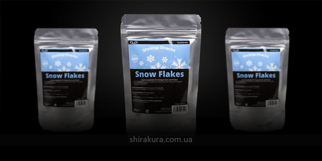 GlasGarten Shrimp Snacks Snow Flakes - додатковий корм із натуральних соєвих висівок для креветок та раків. Багатий на вітаміни, амінокислоти, мікроелементи і клітковину для хорошого травлення ракоподібних. Корм швидко розпадається на пластівці, не псує воду.