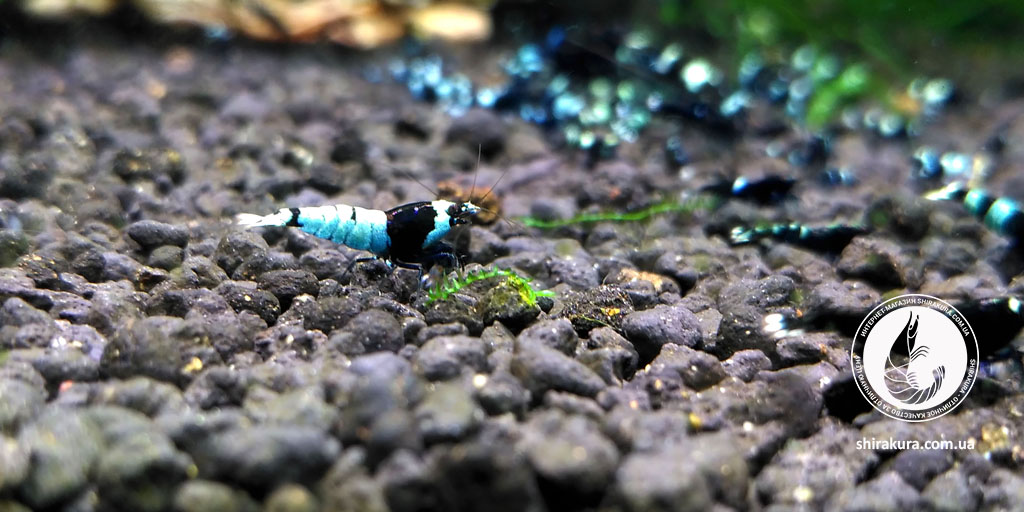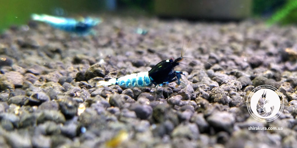 Ця селекційна форма креветок має щільний насичений чорний та білий (блакитний як варіація) колір панцира.