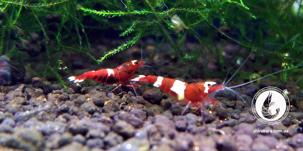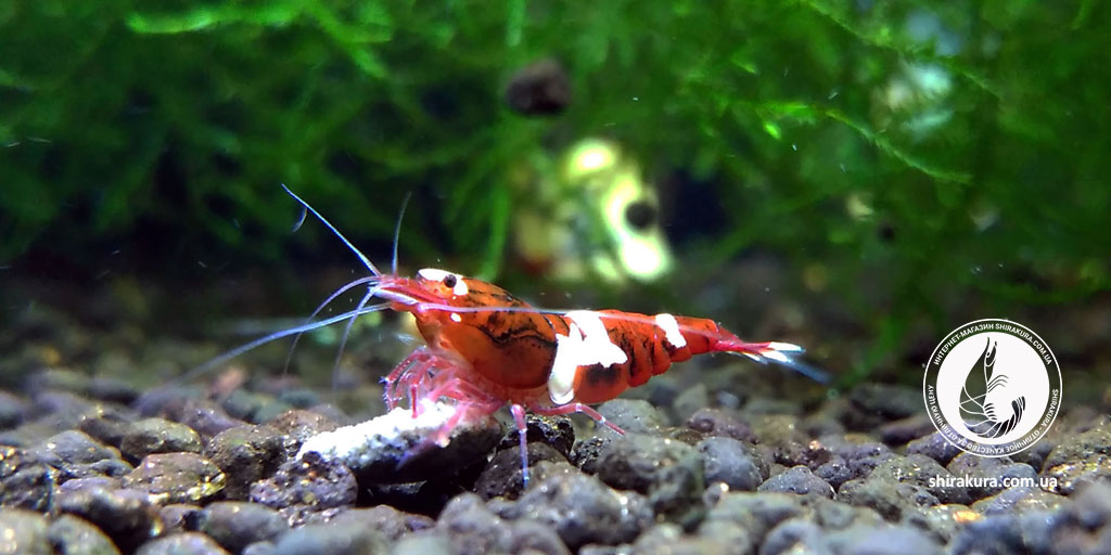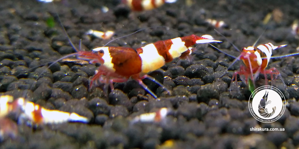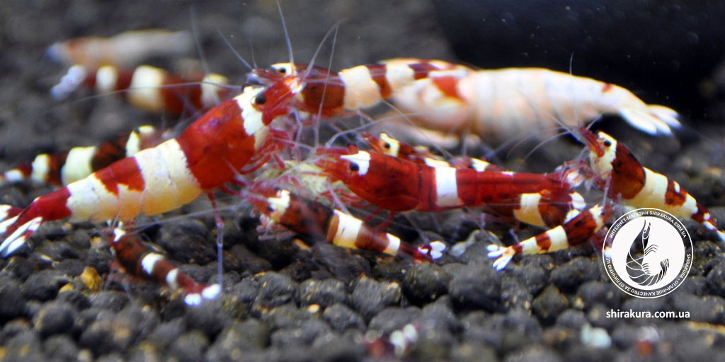 Ця селекційна форма креветок має щільний насичений винний та білий колір панцира.